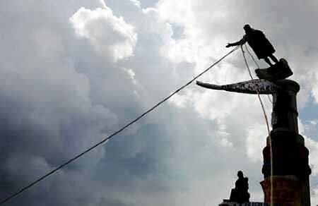 Според опозиционния вестник "Ел Универсал" протестиращите овисили статуята с главата надолу и скандирали "Справедливост за народа, справедливост за народа!" Каракаската полиция и национална гвардия си възвърнали статуята и арестували петима случайни.